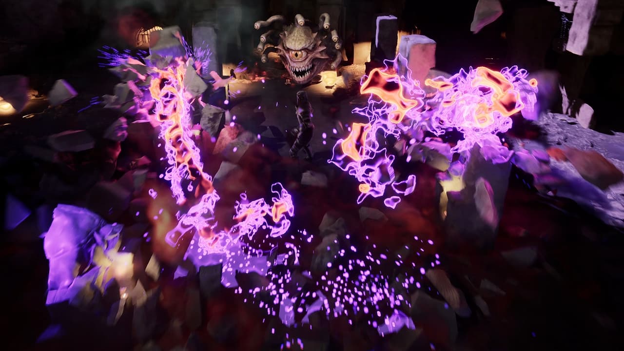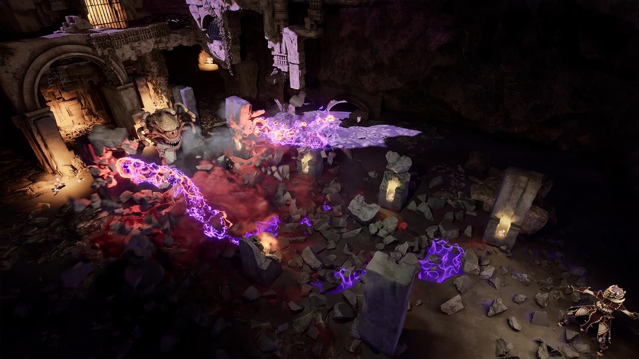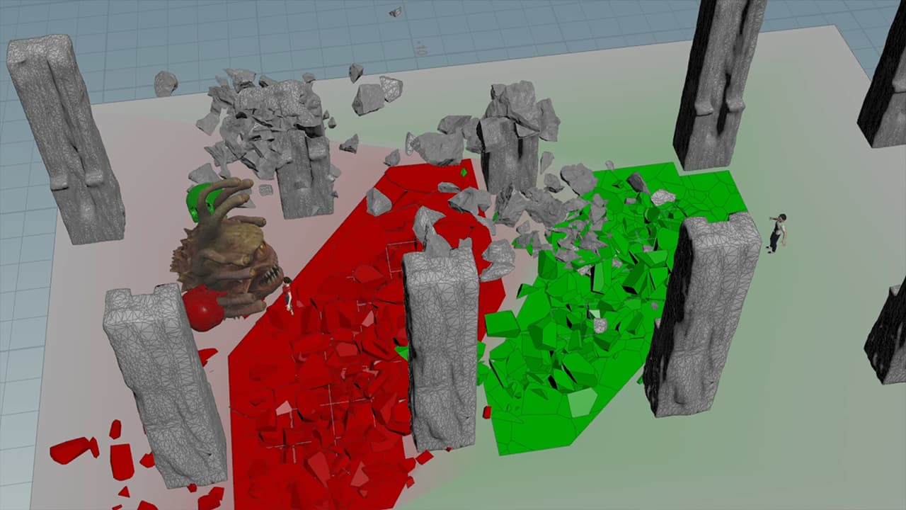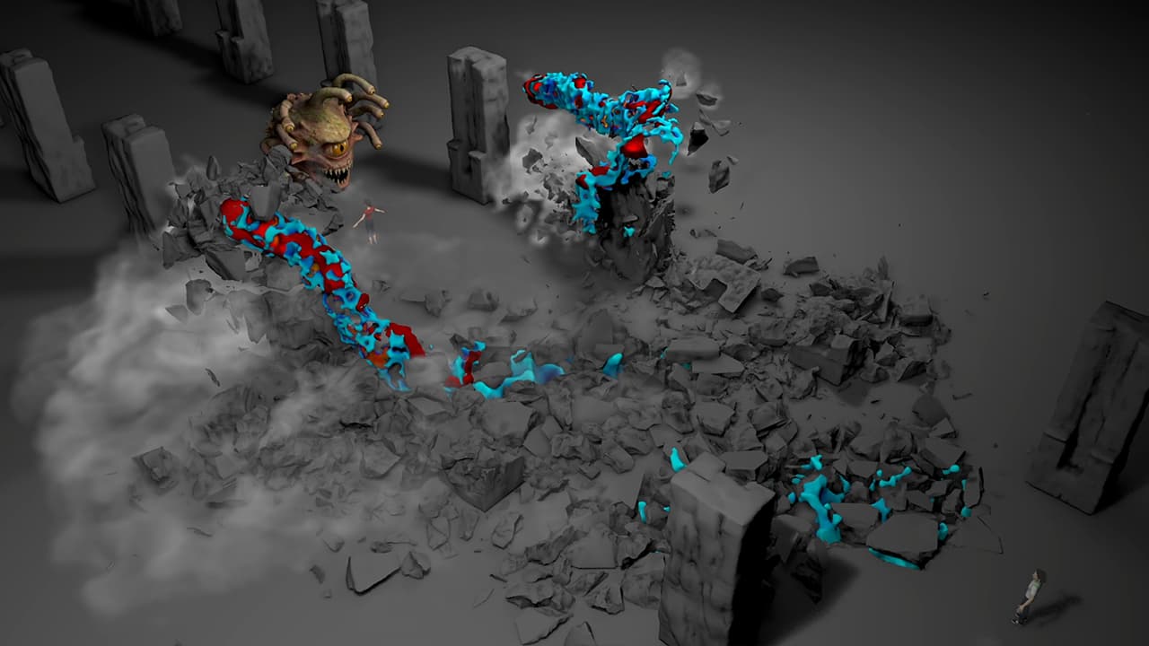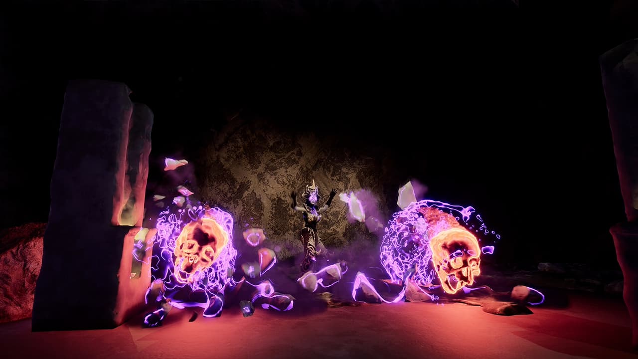 To highlight the spell’s physical nature, I explored which elements could be destroyed and what projectile types would work best. After a few trials, I chose common, yet proud skulls as the projectiles, moving along paths that affect both terrain and upright columns.