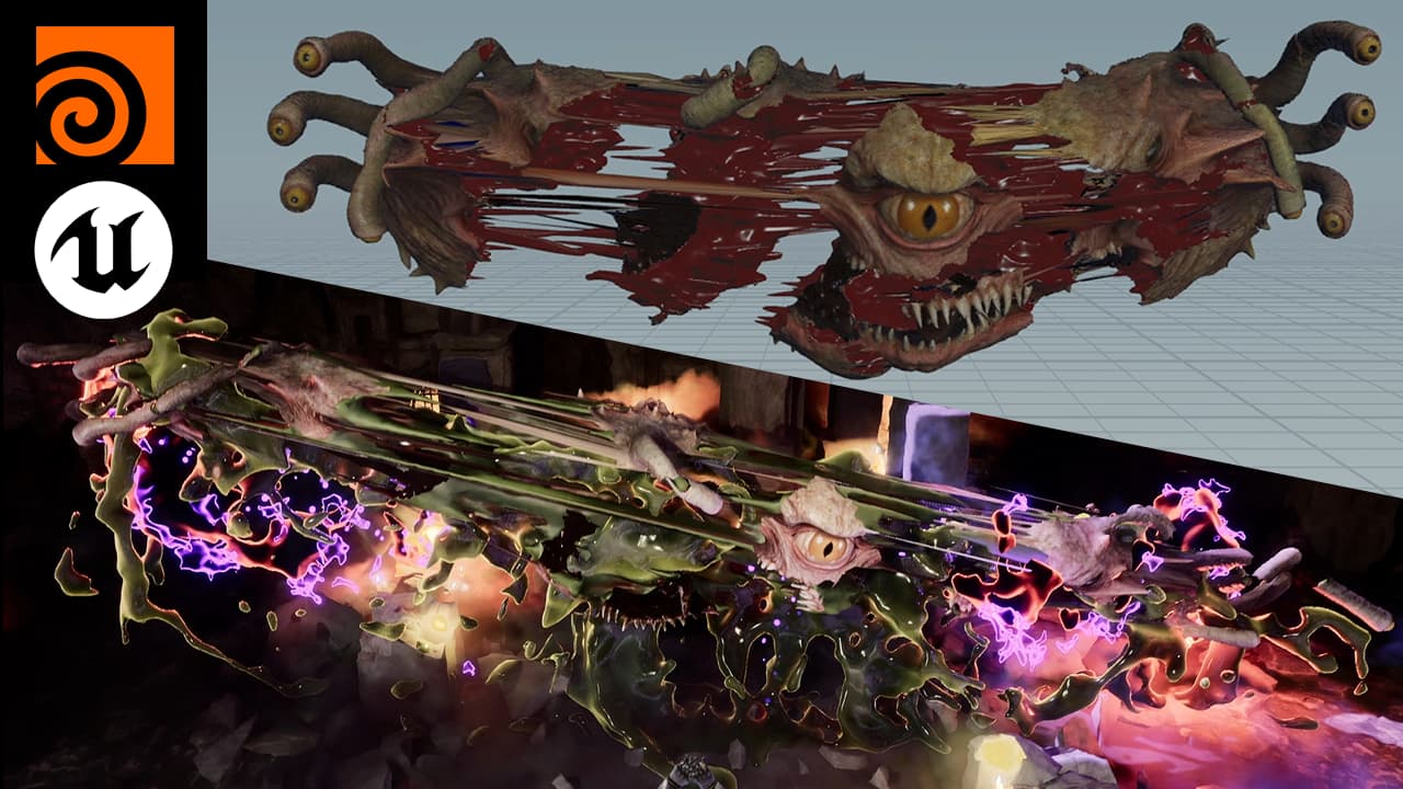 Not everything went through the same process: blood and guts were exported as VAT fluids without UVs, colored directly in Houdini, while the skin had to keep proper UVs and was deformed using point deform on the original mesh.