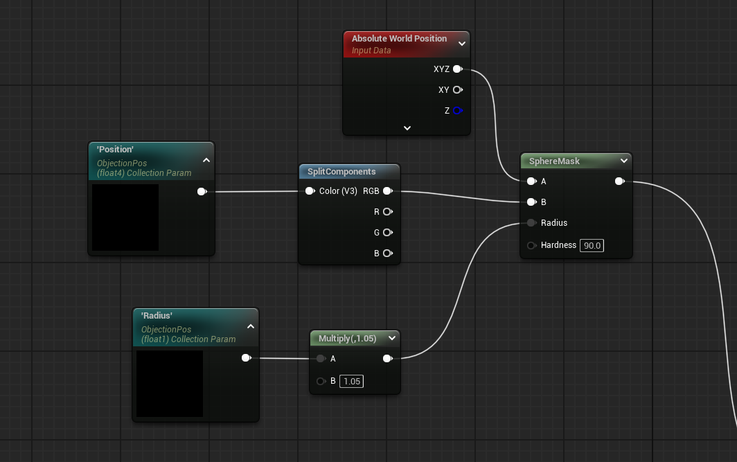 As a first prototype I used a sphere mask to control the opacity of a object. This Sphere mask could be controlled by using material collection parameters for its inputs. The parameters are set dynamically in a blueprint taking the position and radius from a sphere in the level.