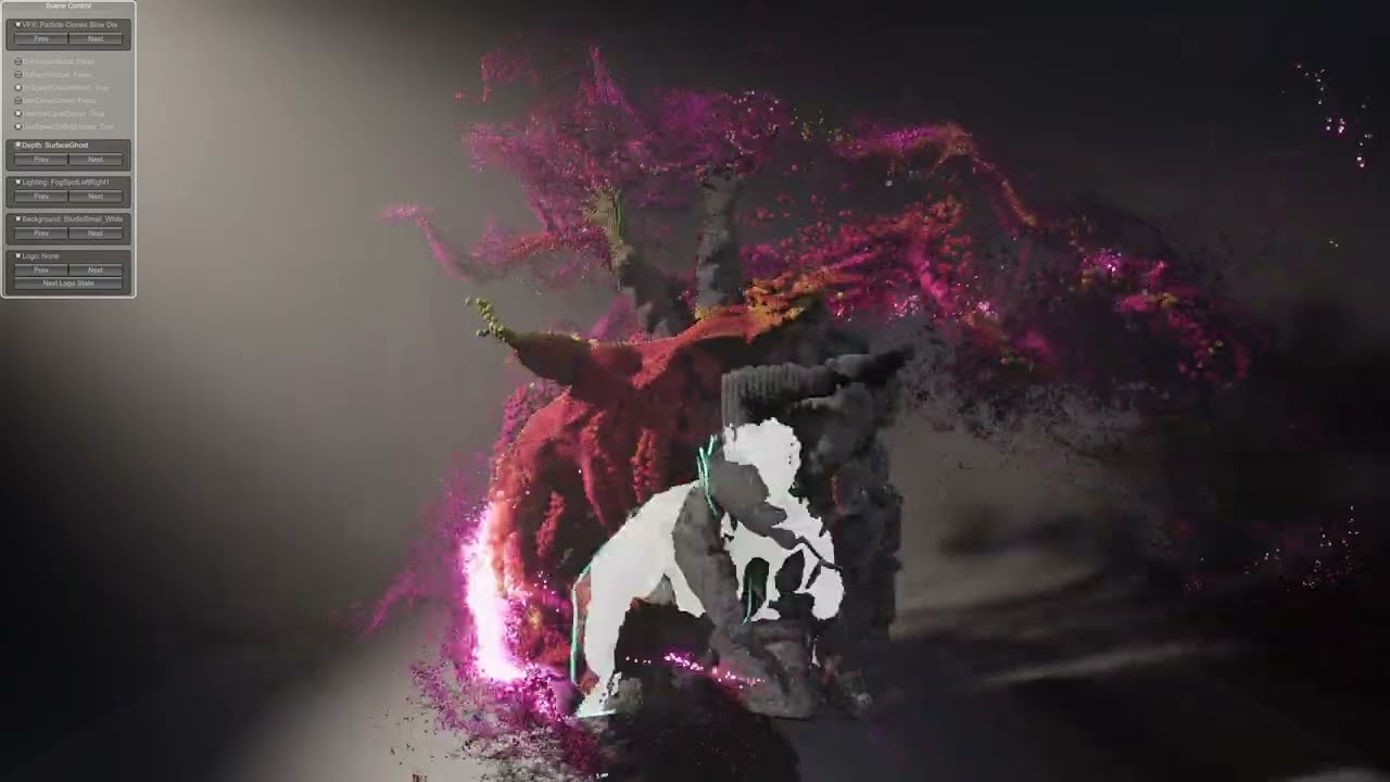 And a happy accident when using wrong debug buffer in overlay with a Y invert - I was really taken with the mirrored/kaleidoscopic motion so I’ll probably have more of a dig into that, but making the actual particle spawning and flow mirrored, to remove the ghosting and make the lighting correct: