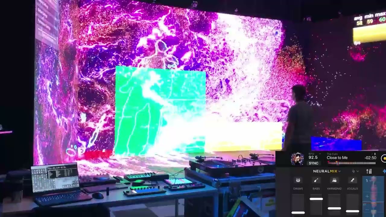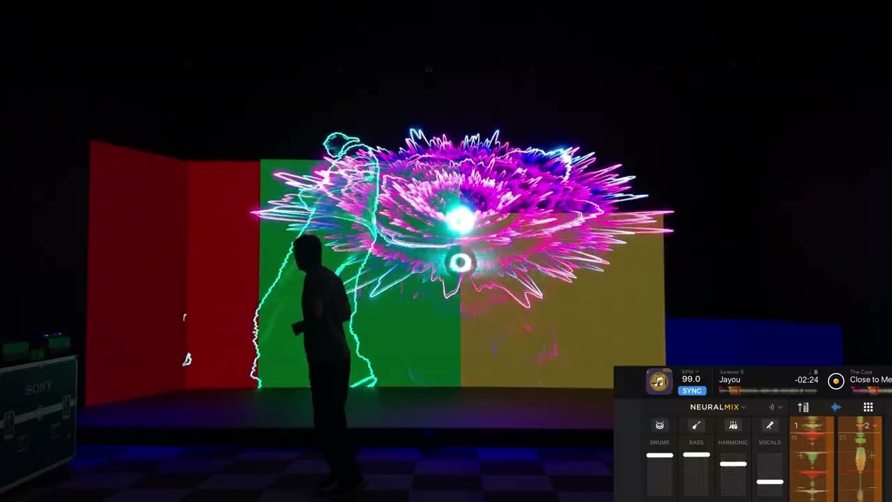 This one is similar to 425, with motion in areas controlling DJ app stems level (drums, bass, melodic, vocals), but with an inverted mapping for deck 2, so that the motion is crossfading between stems of 2 tracks (Jurassic 5 and The Cure) for a live, motion-controlled remix: