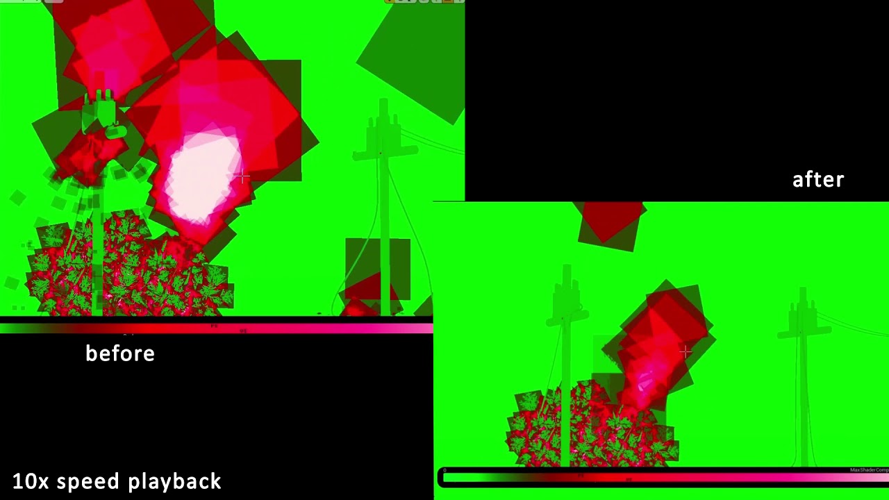 With JWoodard and Travis’s advice (thanks!!), I addressed my smoke stack’s overdraw issue by adjusting spawn rate, lifetime, init velocity (they were moving too fast, too), and size by life / init size. I previously misunderstood how those factors combined were affecting my overdraw, so thank you both! In the shader complexity portion of the video, there’s a pretty sizable difference in that smoke stack’s results, and I think I kept a decent bit of it’s previous appearance intact.