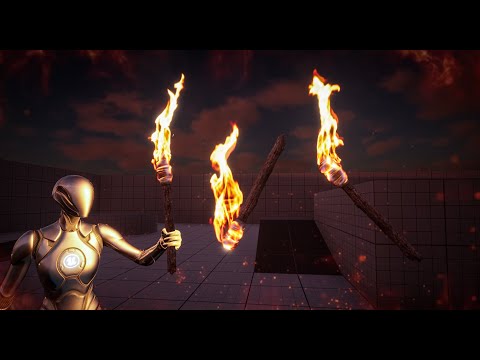 The flame itself is simply done with fake physcis created by an endpoint that will slowly move to the center (in the hlsl code) and then move upwards. when the torch is moved the endpoint is locked within a certain radius to prevent it from further extending. lastly i calculate the overal speed to make the flames shrink with that value i then slowly bring down over time. The flame is constructed with bezier calculations. I also push down the first points of my ribbon so that it nicely attaches to the knob of my mesh.