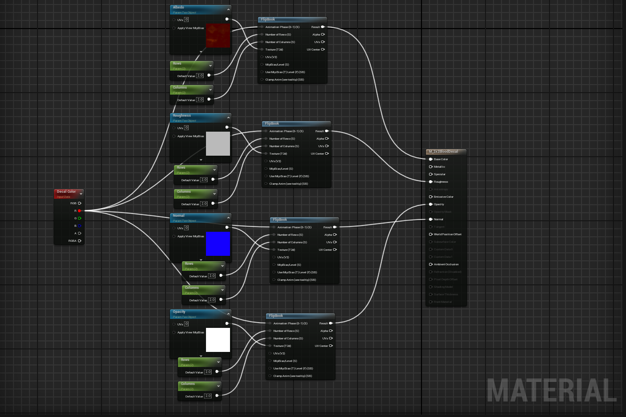 I think i found a better solution, creating a 2x2 texture in photoshop or however many variations you want in an even grid and then in the decal material you want to use the decalcolor node to control a variable of 0-1 randomising the frame selection. Dynamic materials don’t work for decals so this is the work around, you can use either the r channel or a.