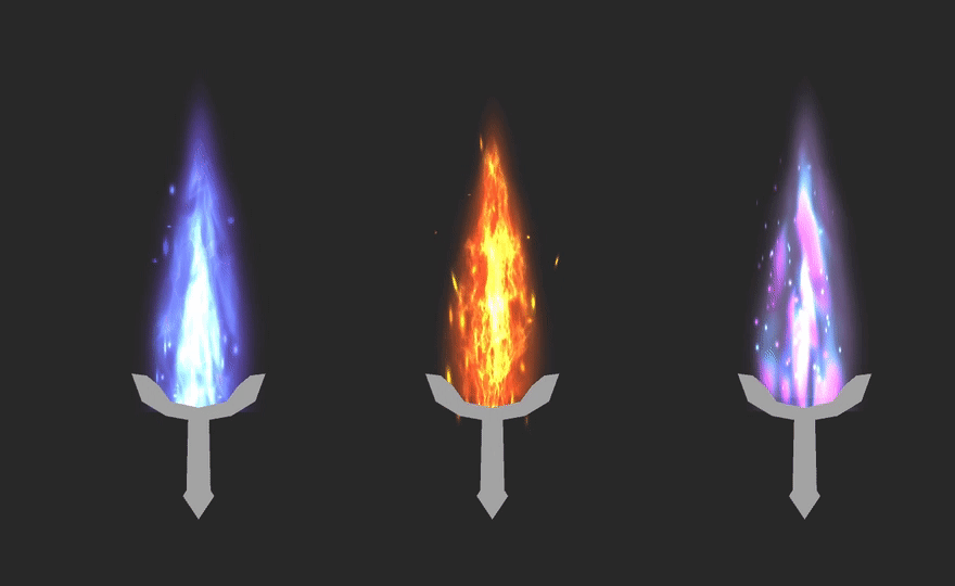 What I can say is that you’re off to a very good start, and the major question here is how to take your awesome 2D experience and translate it into believable 3D elements. One thing I’ve found helpful is going back to the roots of how elements work in real life. For instance, fire always has a fuel source. So as I’m building a flame, yes I put a couple of emitters to build the burning plasma, but I also need to make sure there’s a bright hot point at the core of the flame, or the fuel source. Also, fire emits smoke, so some subtle smoke puffs would also be helpful. Your “rainbow” element sword struggles the most of those 3 with having a defined cause/effect between its emitters. Currently, it betrays itself as a particle system, and fails to sell itself as a believable magical reaction.