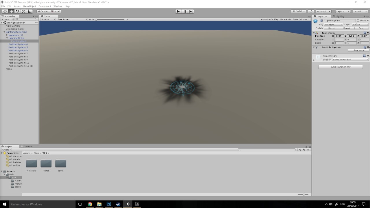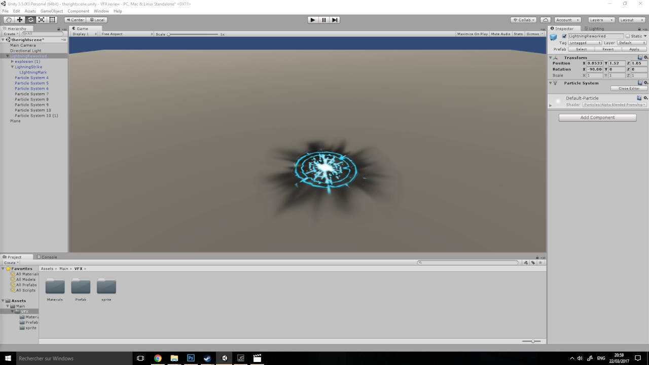 Hey dude. It’s a good start! The scrolling texture on the lightning (I assume scrolling texture base on the tiny video on my phones screen, correct me if I’m. Wrong) looks a bit off. Lightning tends to stay pretty fixed in place once it anchors itself. This can be handy as it means you can make some interesting shapes without having to worry too much about the animation. I almost always do lightning a thin mesh as well since that way you don’t need transparency. If you put the pivot at the base of the bolt then some random rotation will give you a lot of variation for free if the mesh looks different enough from different angles. You could also experiment with swapping the mesh you use once or twice at the start to give a feeling of flickering energy.