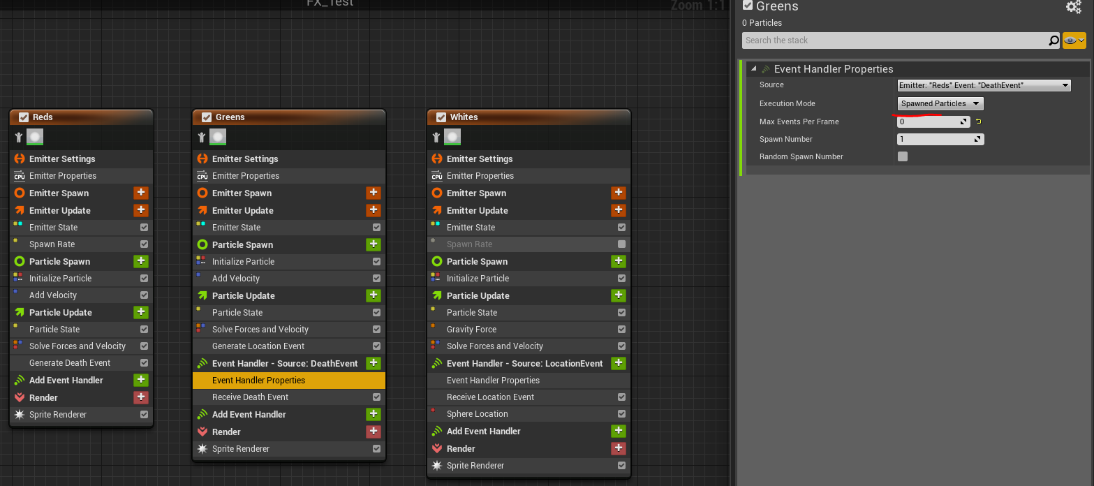 this is a test…So i am using the red ball to spawn up. it dies. then the next emitter gets that death event and spawns. it is attached to another even location that spawns the white stuff falling down. So there are 3 parts, the red dies and spawns a line of sprites, then the white stuff is attached to their location… works as expected EXCEPT for some reason I get a puff of the white falling that spawn at the reds original location…WHY?? i’m going crazy with this. thank you in advance… !!