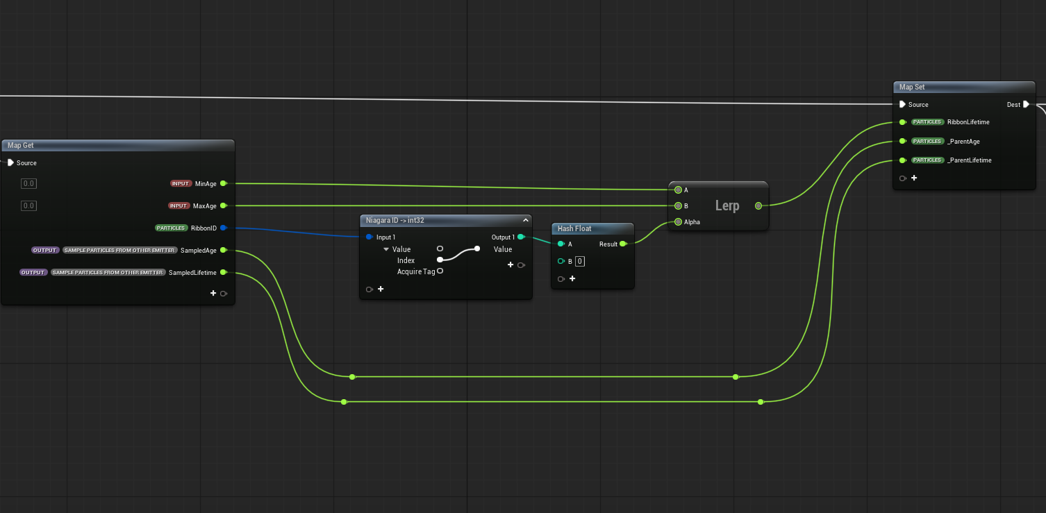 Once you do that, each of the particles in your ribbon will have the exact same normalized age value, based on the min/max age you set in the first scratchpad. This way you can have multiple ribbons with different lifetimes and the animation will play perfectly based on that.