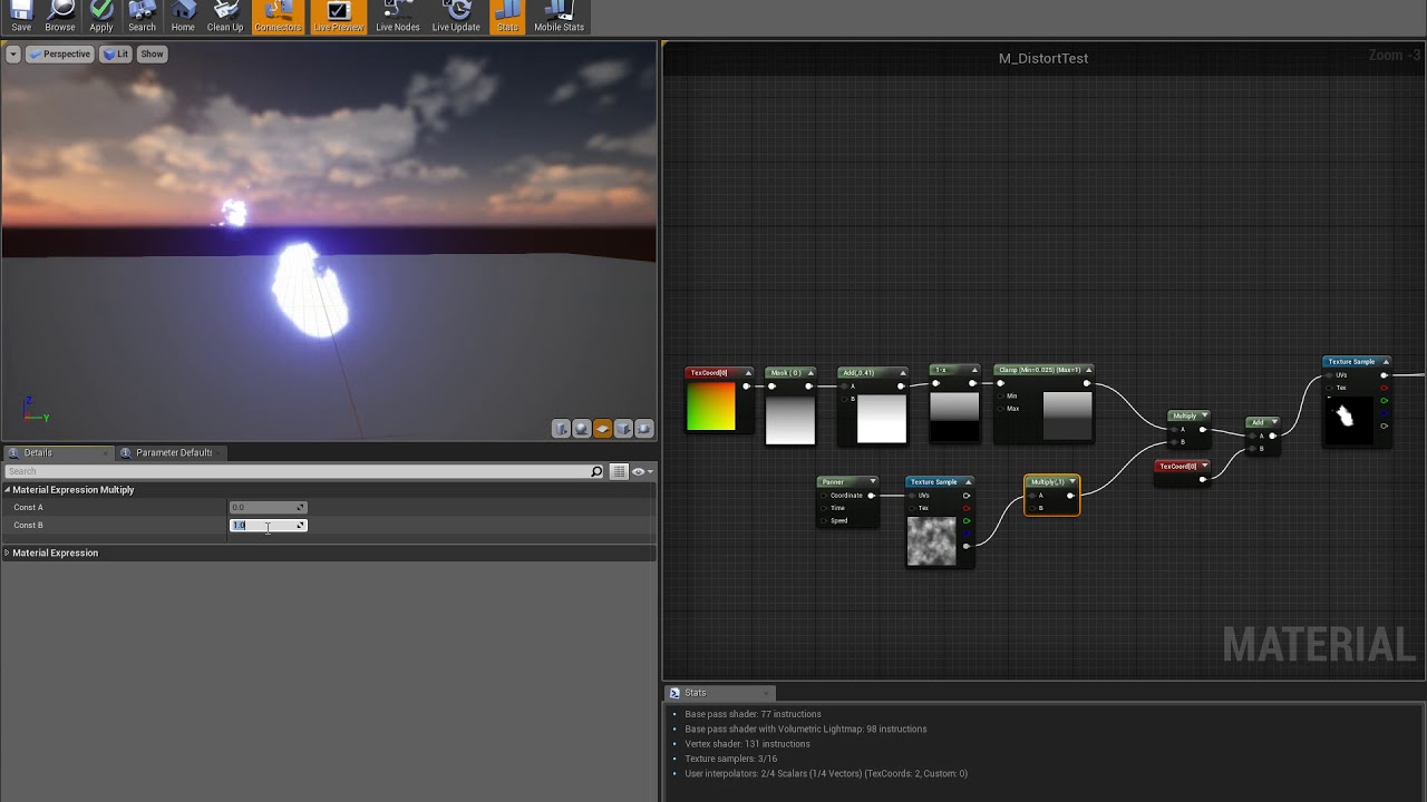 I was wondering if someone could help me fix this material. I have a basic scrolling noise texture hooked up to a gradient mask. The aim being to have a sphere that distorts only slightly at the bottom but alot at the top.