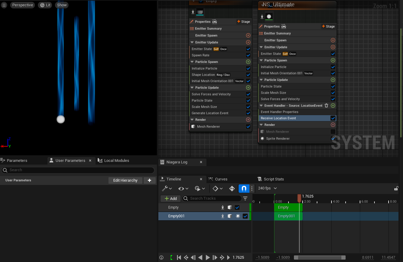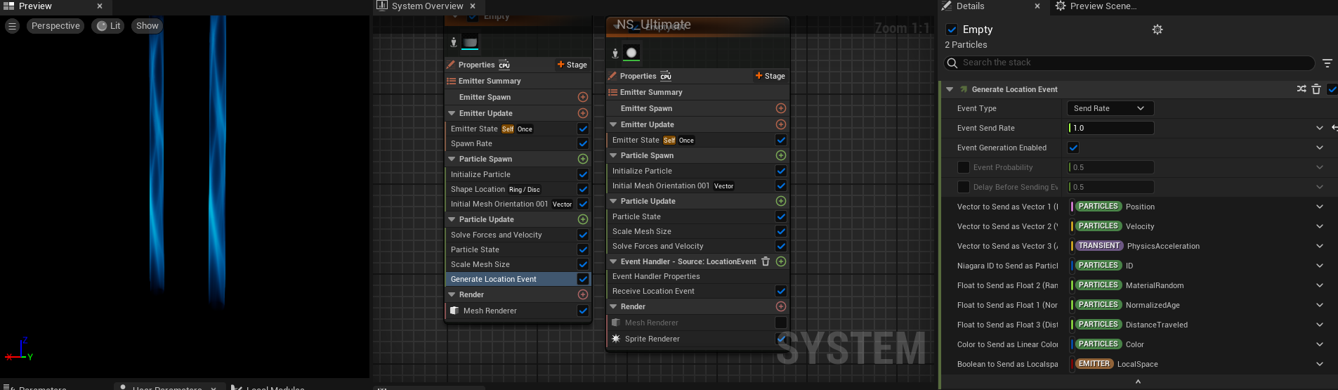 Hello everyone, soo I’m having this issue with Niagara where I want to spawn Meshes and from those meshes I want to spawn another on the same location. So I have used before and never had an issue the spawn from another emitter and using the event handlers location. This time for I dont know what reason the second mesh always spawns but with delay. So played with the numbers and when I upscale the send rate numbers they spawn on time but they spawn more one over another, and I just need one. So is there any fix for this or any other way because I needed to do this for another vfx but wasnt able to.