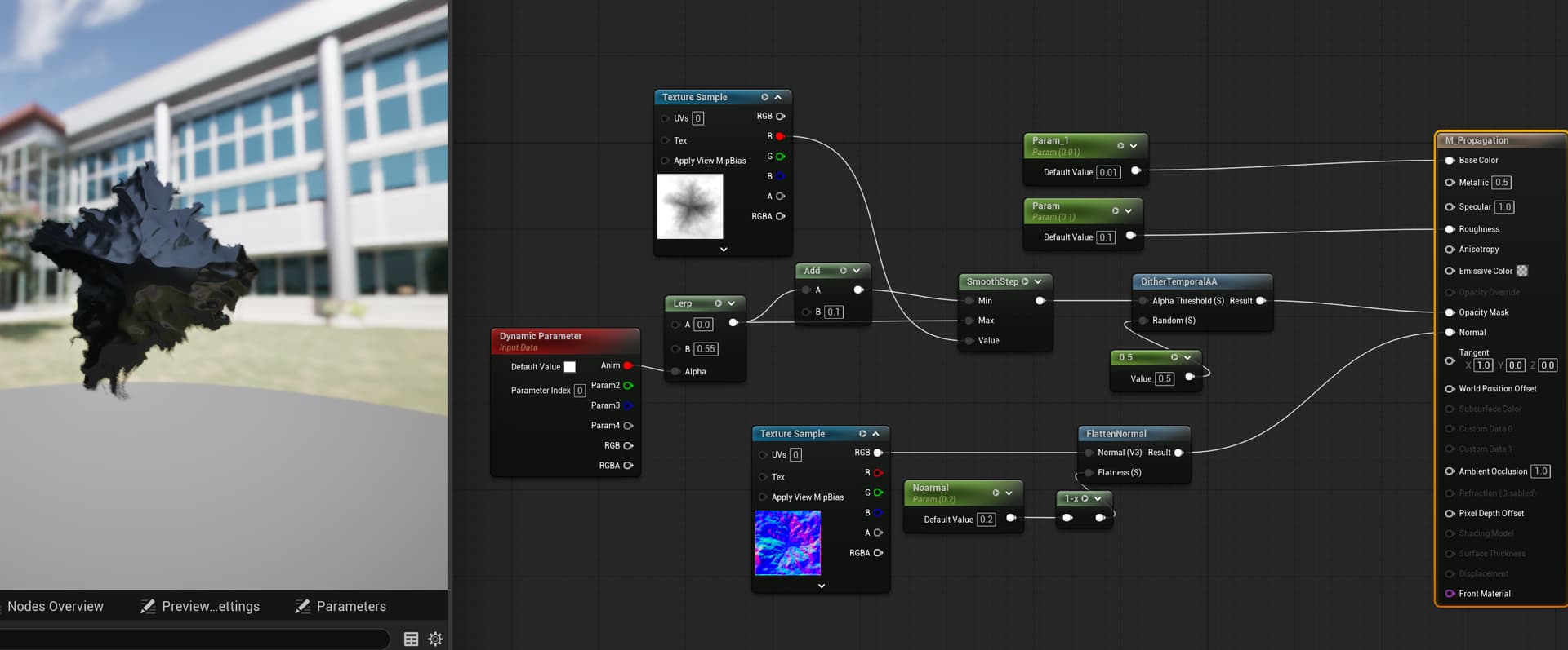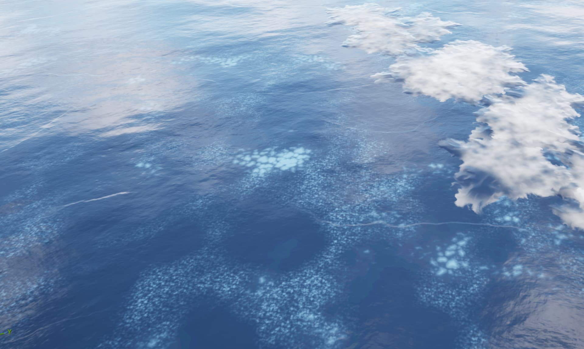 To achieve a similar result with the bubbles, you can create a bubble texture and use different tiling, noise masks, and bump offset to add a bit of volume. I used a simple noise instead of actual bubbles — that should be sufficient so we don’t spend too much time on something that isn’t a high priority right now.