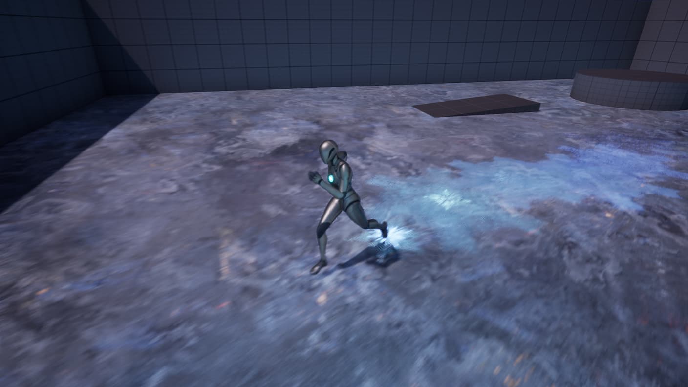 When she steps, we see a close-up of all the tiny details of how the snowflake spreads. The reason they show the very first step so close is to highlight the most satisfying part of the effect — the beginning of the propagation and the contrast of the bright elements. When she walks, it’s not just footprints in snow or wet ground — the surface actually freezes behind her. Each step turns into a snowflake roughly the size of her body. After a few meters, we see an entire frozen path behind her, wide enough for two people to walk side by side.