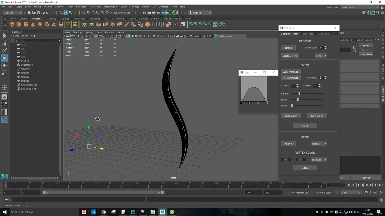 I changed a little the part of the User Interface where I create the planes, but now I think I am getting closer to something less restrictive than the previous method. Now I can scale the mesh along the curve using the graph but there is a couple of main issues that I need to resolve: