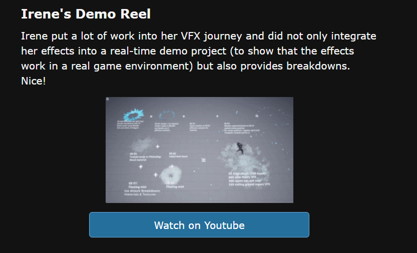 Start networking while you’re making your portfolio. Usually nobody is gonna care your progress as in your portfolio. Instead, put only your best work on your portfolio and show your progress in social media while you’re networking (by asking feedback or just chatting with people). This was hard to see for me. It was clear when in one interview the interviewer already saw that apply feedback and we skipped that part of the interview. Basically, show your work both in social media and on the discord severs where VFX artists are. No need to be supper active if it’s not your jam. It’s not mine. I would say that it’s better that you get used to compliment somebody’s work genuinely rather than forcing yourself to be supper active. [I honestly want to go back to those discords and participate a little bit more to give back what everyone gave me]. I saw this video and it was kind of similar of what I was doing for networking. It might help.